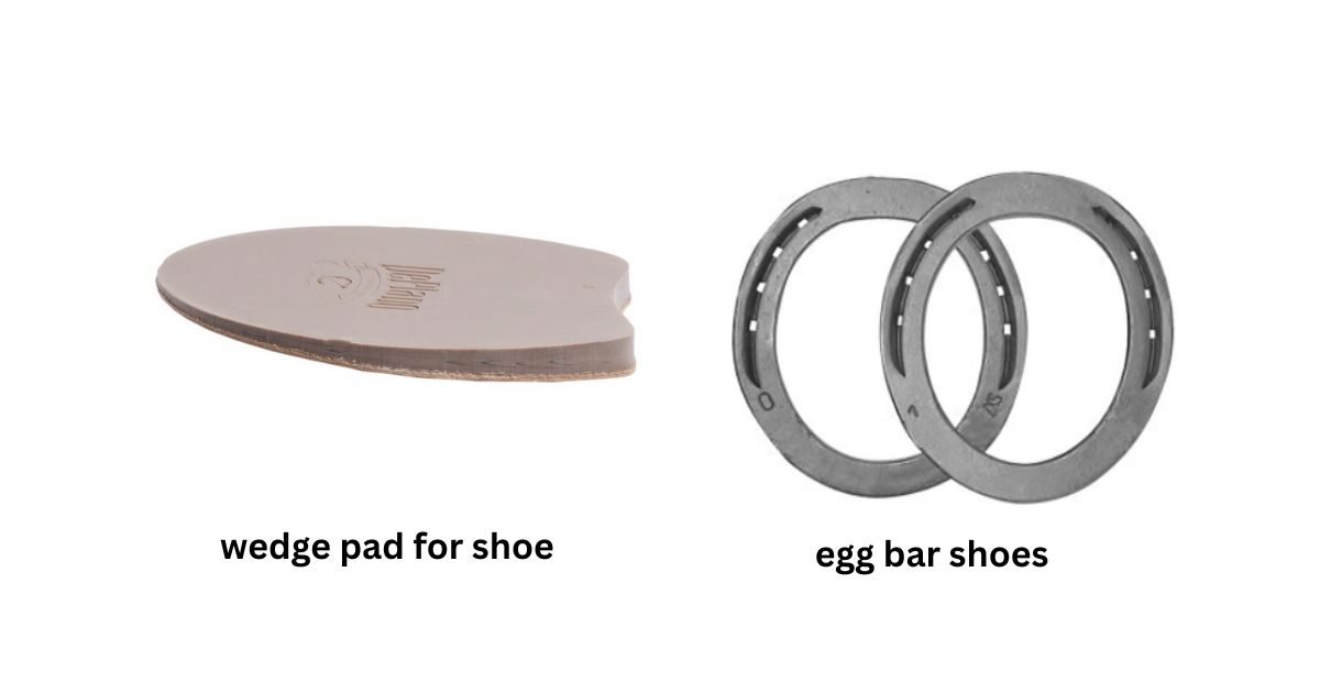 - Egg bar or heart bar shoes for heel support and load redistribution