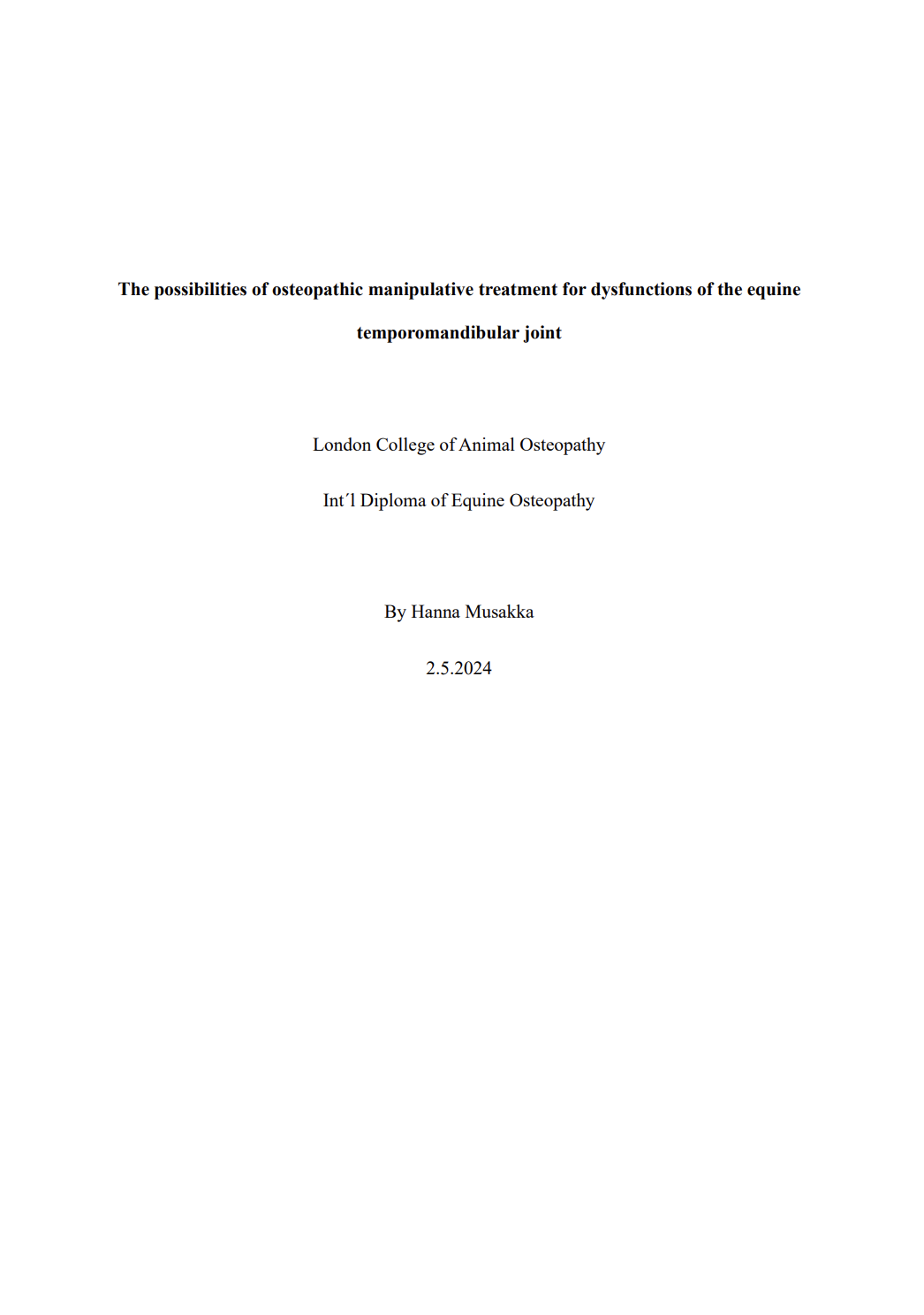 Click on the PDF below to read an in-depth thesis by LCAO student Hanna Musakka exploring osteopathic treatment possibilities for equine temporomandibular joint dysfunction.